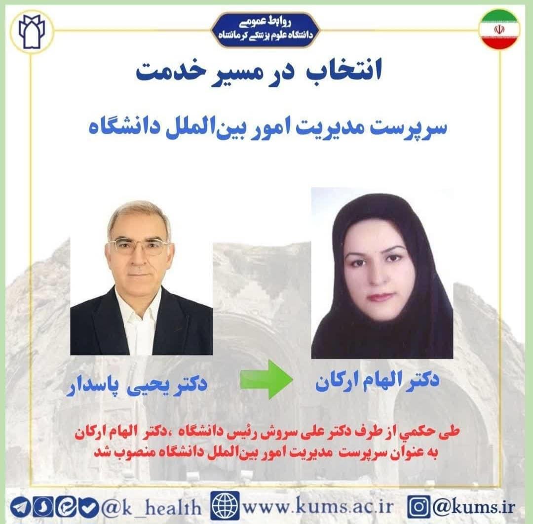 🔹طی ابلاغی از سوی دکتر سروش رئیس دانشگاه؛ دکتر الهام ارکان عضو هیئت علمی دانشکده بعنوان "سرپرست مدیریت امور بین الملل دانشگاه " منصوب گردید.