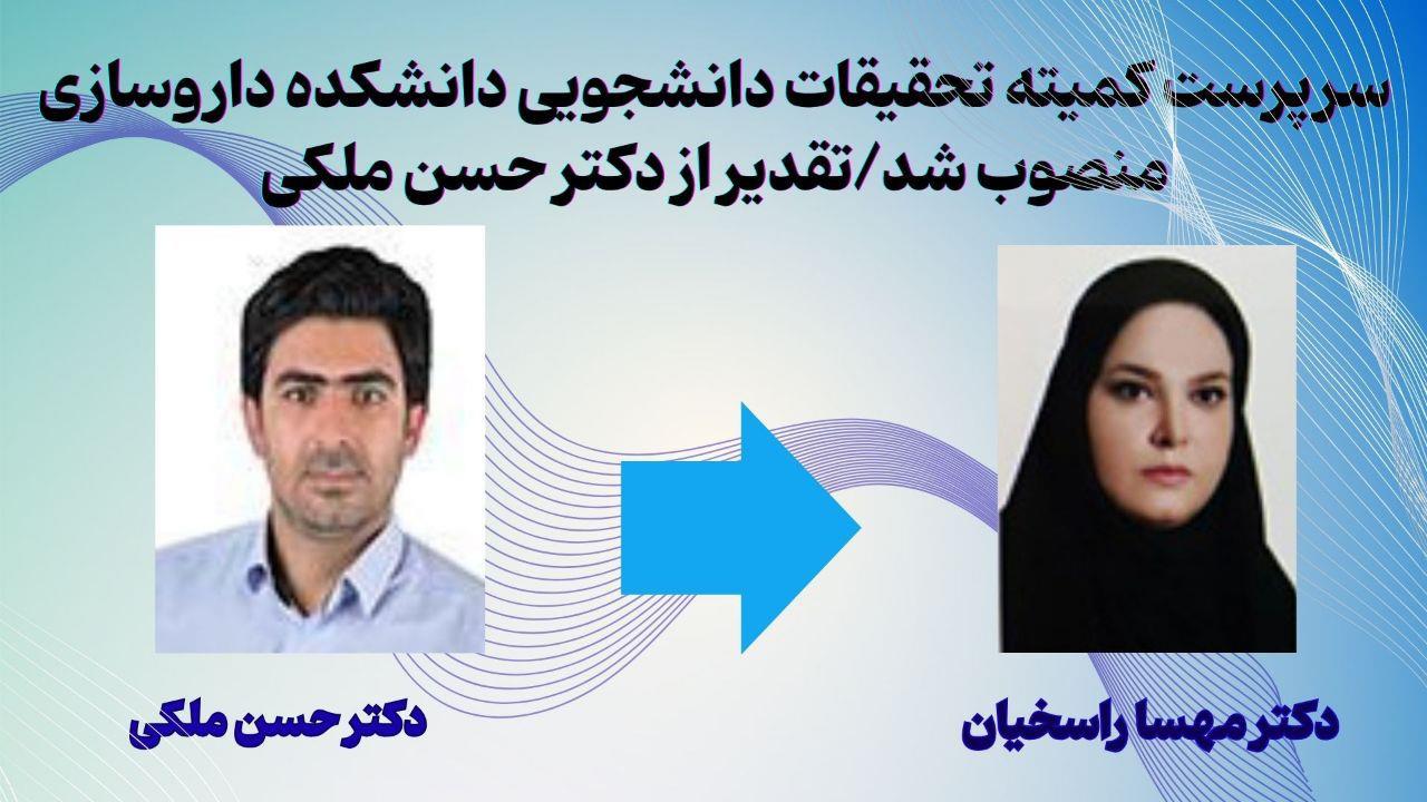 مجموعه دانشکده داروسازی ضمن قدردانی از زحمات ارزشمند جناب آقای دکتر حسن ملکی در دوران تصدی این مسئولیت، توفیقات روزافزون ایشان را در تمامی عرصههای علمی و پژوهشی از درگاه خداوند متعال خواستار است. همچنین موفقیت و سربلندی سرکار خانم دکتر راسخیان را در انجام شایسته امور اجرایی محوله آرزو مینماییم.