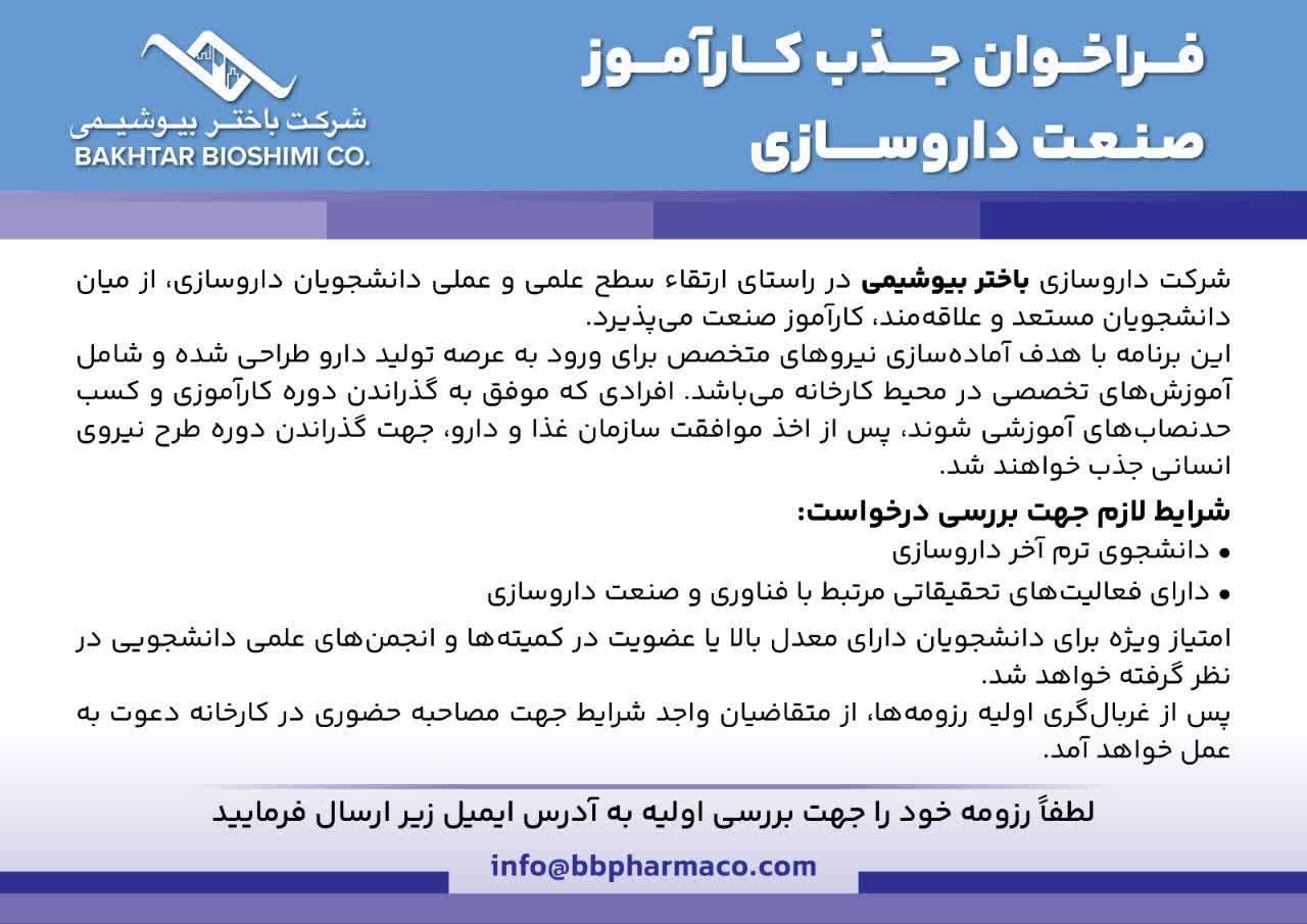 اخبار فراخوان جذب کارآموز صنعت داروسازی « شرکت داروسازی باختر بیوشیمی » ۲۶ آبان ۱۴۰۴ ۰۸:۲۷ نظرات بینندگان میانگین امتیاز کاربران: 0.0 (0 رای) 12345 امتیاز 12345 برای امتیاز باید عدد وارد کنید نام را وارد کنید ایمیل صحیح نیست ایمیل نمایش داده شود. تعداد کاراکتر باقیمانده: 500 نظر خود را وارد کنید بازخوانی بازخوانی پس از انتشار این نظر، به من اطلاع داده شود. ارسال